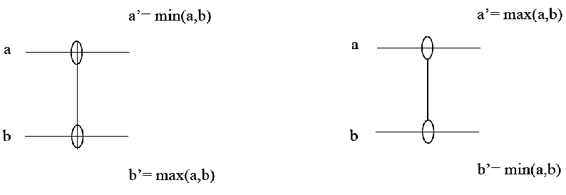 In the increasing comparator circuit (denoted by +) we provide two numbers. In the upper line we get the minimum of the two numbers as output while in the lower line we get the maximum number as output.